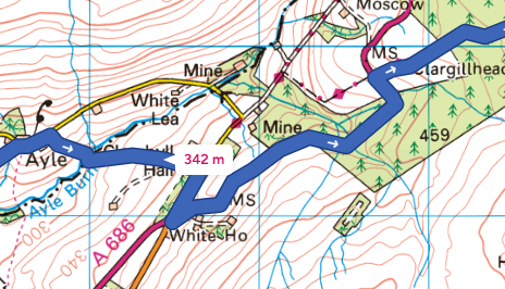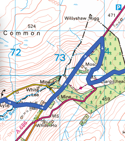 Access to the trail can be gained in either direction on A696 from below Cargillhead (NY 736 498 )to the byway from the road towards Whitfield or along the road and turning down towards Clarghyll Hall. From the other end beyond the former Colliery Mine site (NY 729 498) take the byway back and round to the A696 past Clarghyll Hall. The diversion from either direction is about 1.5 miles. It will be closed for 3 months possibly longer. The map for the 2 diversion options are below: